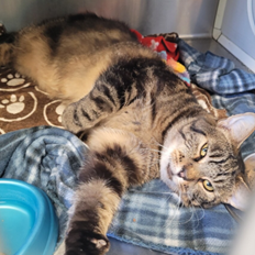 Bacon is a handsome, 7-year-old, male tabby. He is a little shy at first, but is very loving once he gets to know you. He was rescued from a kill shelter. His front right leg was fractured and healed, so he occasionally has a limp, but other than that he is totally fine.