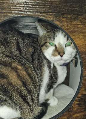 Born February 14th, 2018, Leo is a large, handsome, tabby boy with white paws. Leo’s world changed when his beloved owner entered hospice and sadly passed away. The hospice center did everything they could to find him a home, but when they weren’t able to keep him there, Leo was brought to a veterinary clinic to wait for his next chapter. He spent six long months living in a cage, surrounded by constant barking dogs and unfamiliar sounds. The stress of that environment left Leo understandably shy and unsure at first. Eventually, the café was contacted to give this sweet boy the fresh start he so desperately needed. Despite everything he’s been through, Leo is truly a lover at heart. He wants nothing more than a calm home, a soft place to rest, and someone to love again.