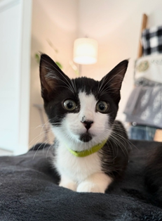 Mirabel is a pretty, tuxedo, girl born June, 2025. She was relinquished by her owner when their cat had kittens, and they couldn’t take care of all of them. Mirabel is a star athlete! If kitten soccer were a thing, she’d already be MVP. She zips around chasing her yarn ball, showing off fancy footwork, and outmaneuvering her siblings with ease. Playful, energetic, and endlessly entertaining, Mirabel is a tiny bundle of joy ready to bring laughter, love, and excitement to her forever home. 💕