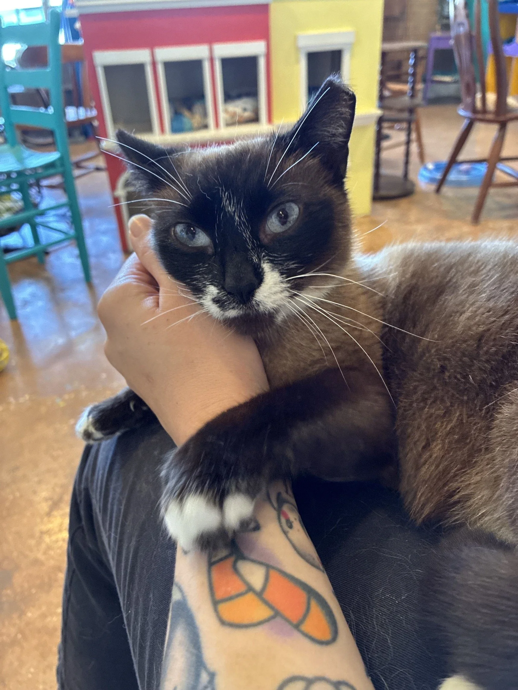 Born July 2024, Lotus is a beautiful snowshoe Siamese girl. She was rescued from the streets of St. Augustine after she was abandoned by her owner who was evicted from their home. Despite her rough start, Lotus has the sweetest, most affectionate nature and truly thrives on human companionship. She adores her people and is always on the lookout for a warm lap to curl up on. Gentle, cuddly, and calm, Lotus loves soaking up attention and being close to those she trusts. She does well with other cats and would be happy sharing her space with a feline friend.